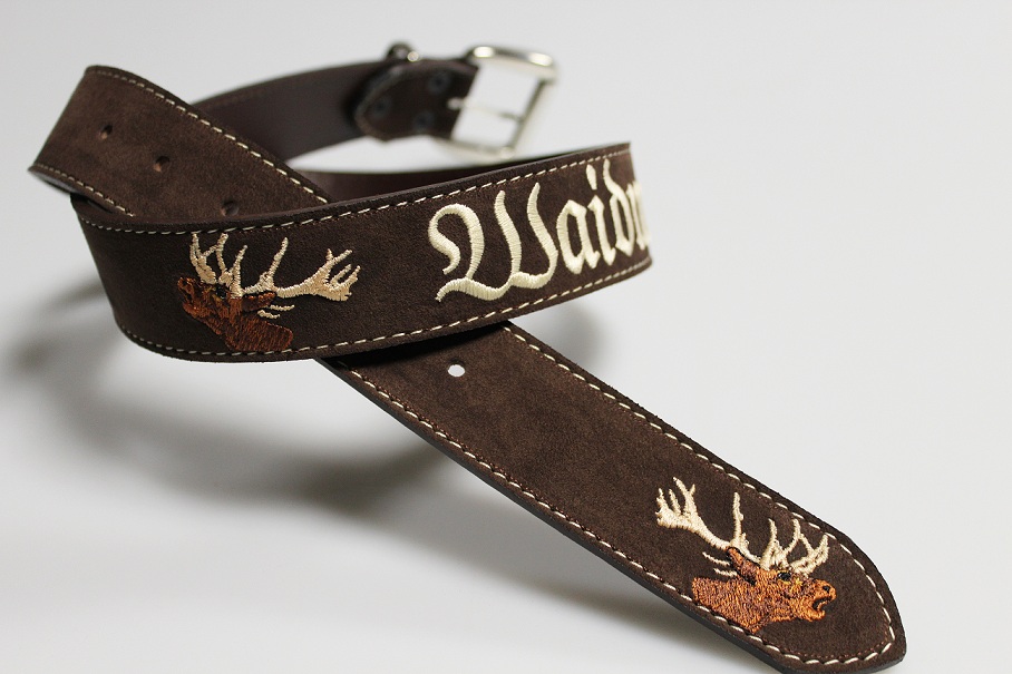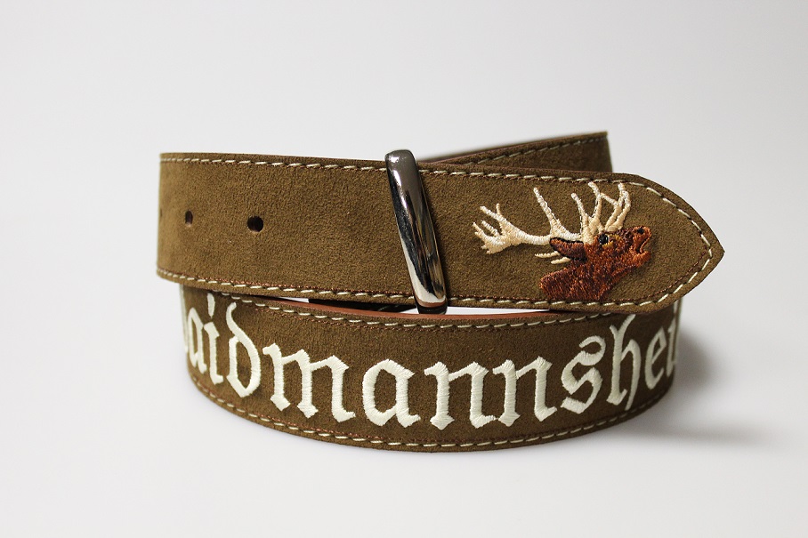 Waidmannsheil - Alcantara Hosengürtel mit hochwertiger Stickerei veredelt & hell beigem Stepstich abgenäht.